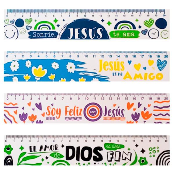 Nuestra Regla Plástica de 20 cm es la herramienta perfecta para estudiantes y profesionales. Fabricada en plástico resistente, cuenta con frases cristianas motivadoras como "Todo lo puedo en Cristo que me fortalece".