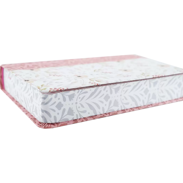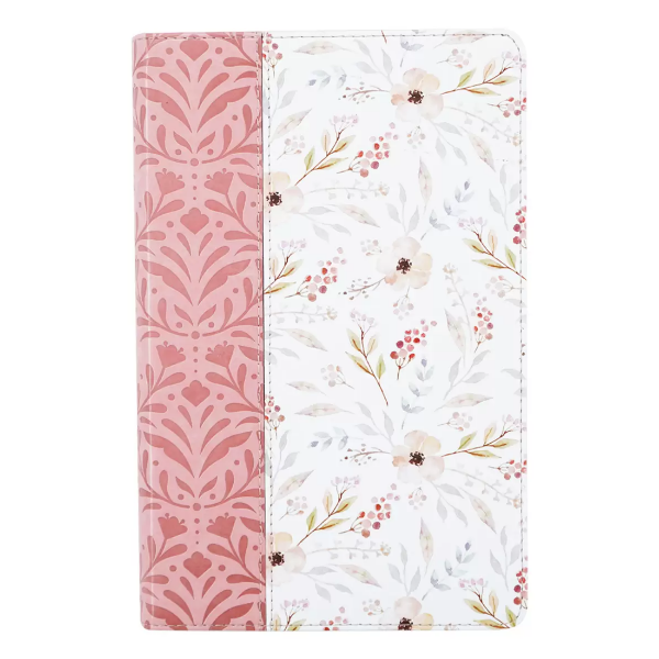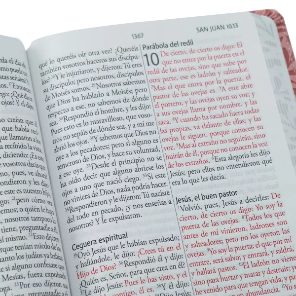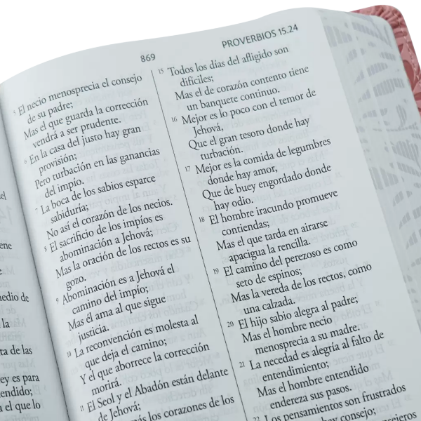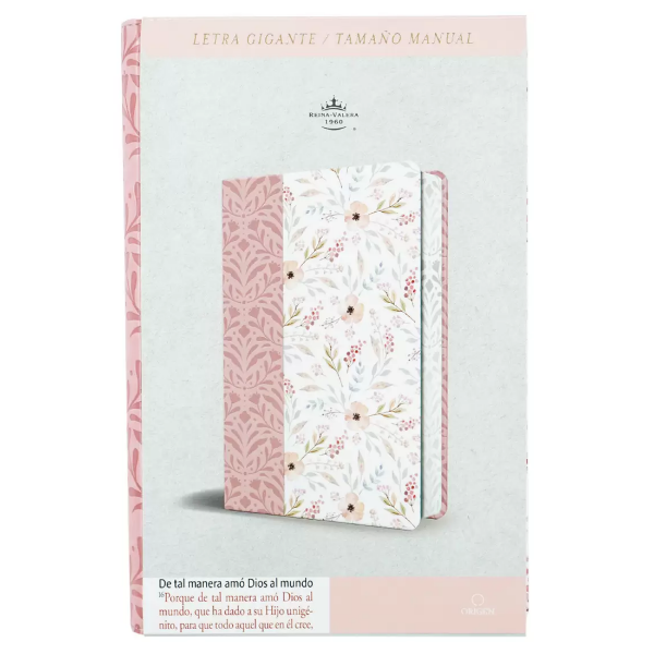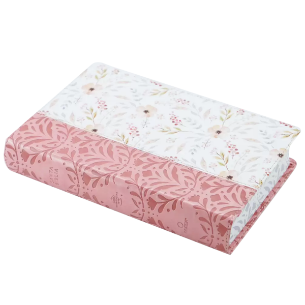 Biblia tamaño manual, ultrafina y con letra gigante de 14 puntos. Piel rosada con flores, cinta marcadora y fotos a color de Tierra Santa.