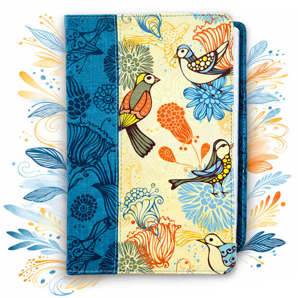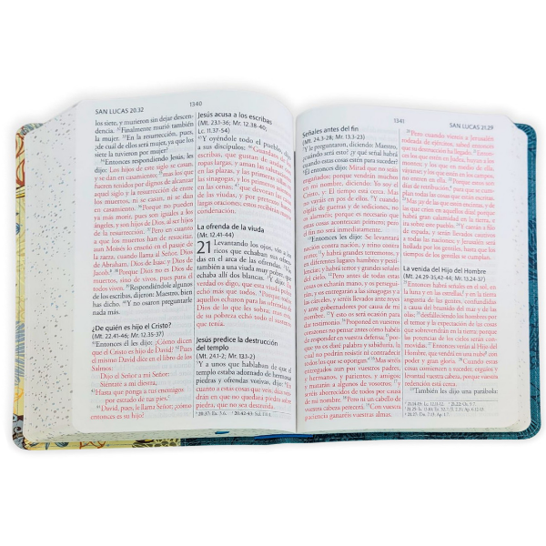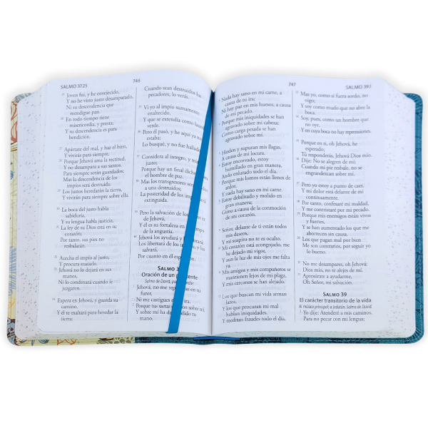 Biblia tamaño manual, ultrafina y con letra gigante de 14 puntos. Piel azul con pájaros, cinta marcadora y fotos a color de Tierra Santa.