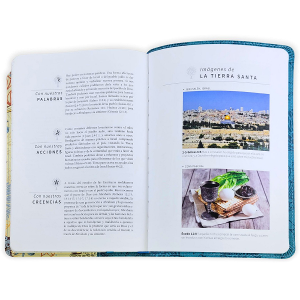 Su encuadernación de lujo en piel azul, con página para dedicatoria, y cinta marcadora, hacen que la Santa Biblia RVR 1960 sea ideal para el uso personal o para regalo. Con letra gigante de 14 puntos, y las palabras de Cristo destacadas en rojo, la Biblia incluye la esencia de Tierra Santa con preciosas imágenes a todo color, que nos invitan a orar por el pueblo de Israel.