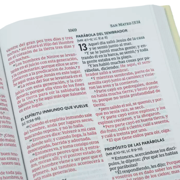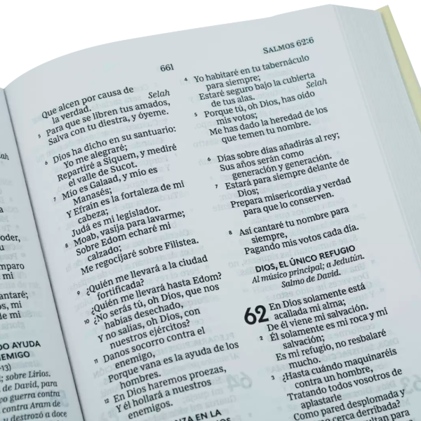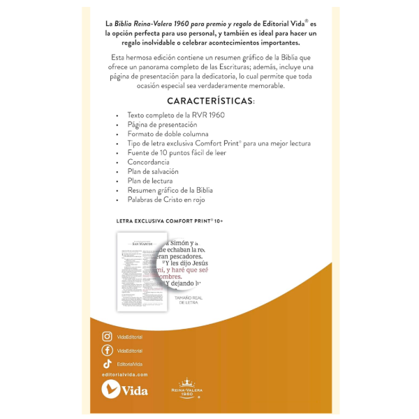 Provistas de características únicas como la tipografía Comfort Print® para la Reina – Valera 1960, un tipo de letra diseñado para evitar la fatiga visual con una lectura más fluida, y el resumen gráfico de la Biblia, una herramienta de estudio práctico que expone el contenido de la Escritura y sitúa a personas, acontecimientos y temas como puntos de partida.