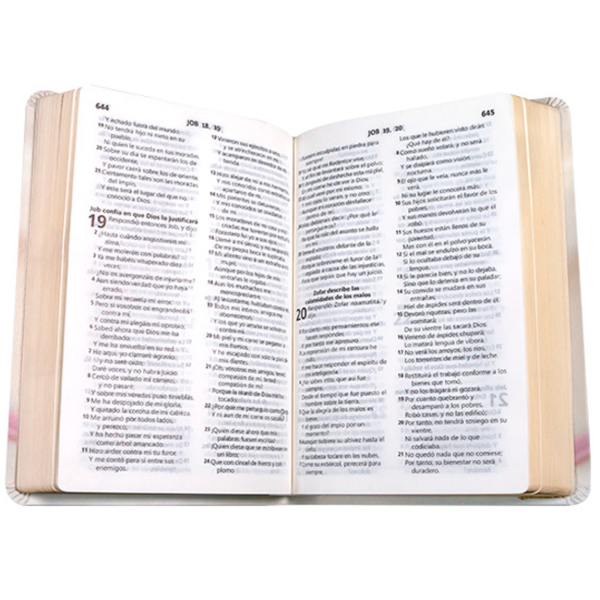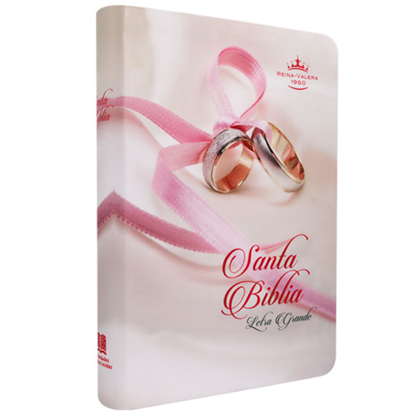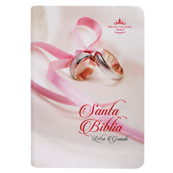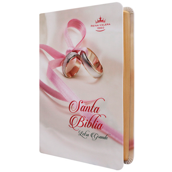 Biblia Reina Valera 1960 con elegante diseño matrimonial en cubierta de vinil con motivo de anillos. Presenta letra grande para facilitar la lectura, palabras de Jesús destacadas en rojo y fino acabado con canto dorado. Edición ideal para ceremonias nupciales o como regalo conmemorativo para parejas.