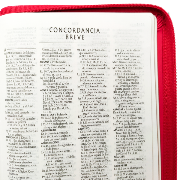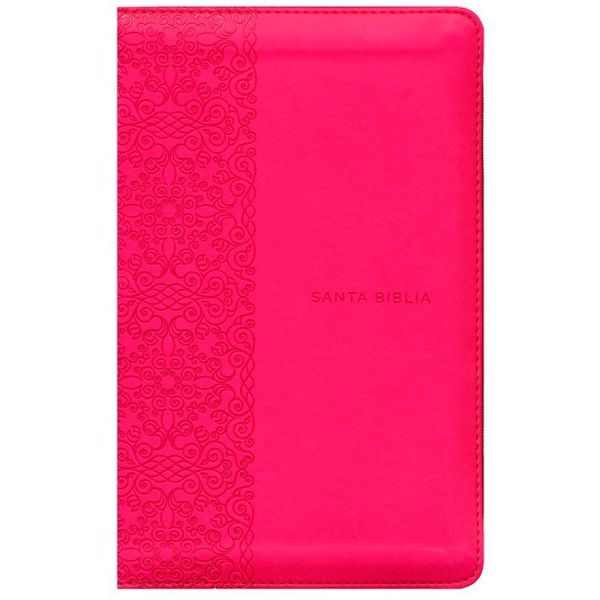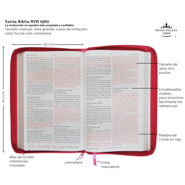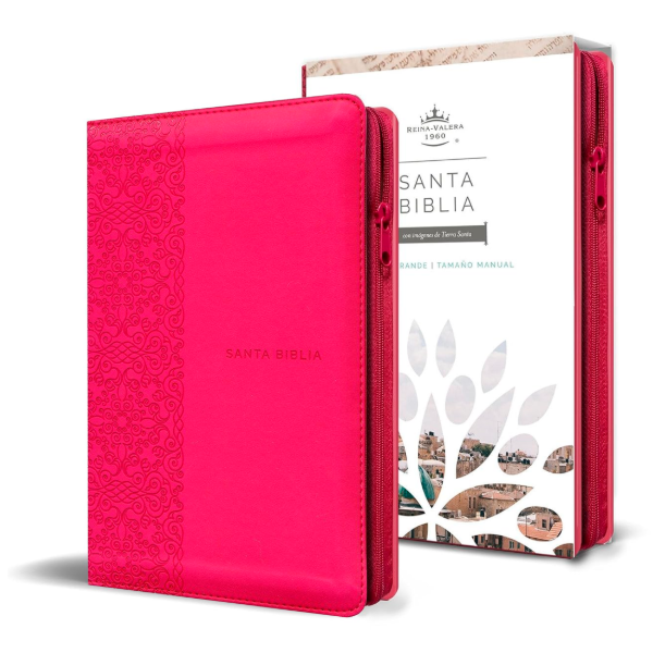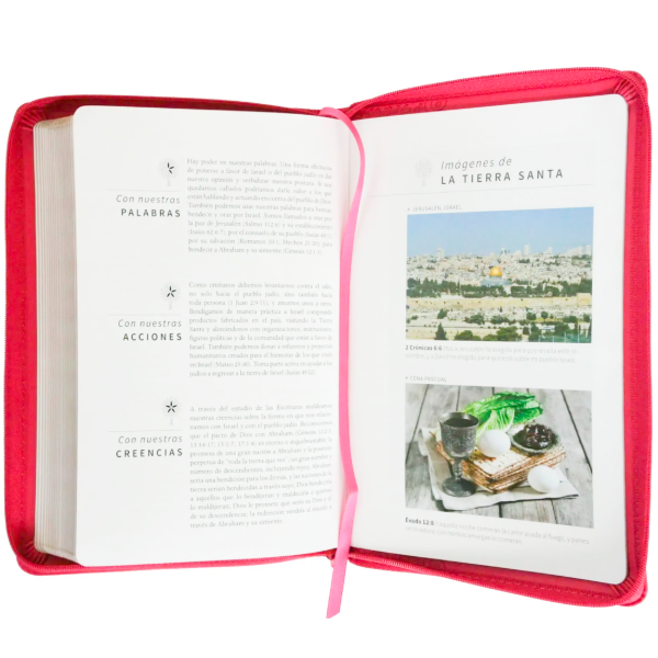 Biblia tamaño manual con letra grande. Símil piel fucsia con cremallera, con canto dorado, cinta marcadora y fotos a color de Tierra Santa.